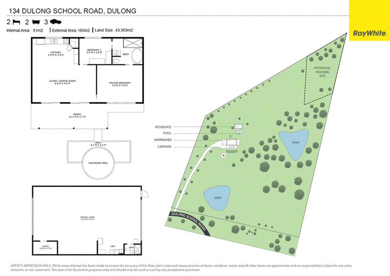 • 81sqm modern shed/house with 2 bedrooms, 1 bathroom, patio areas, and swimming pool.