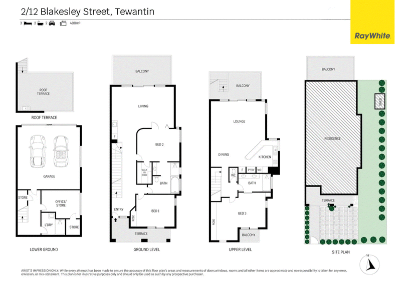 Across approximately 400 square metres, this elegant modern residence comprises three bedrooms, two bathrooms plus third shower in laundry, office, two separate living rooms flowing to covered north-facing balconies, well equipped kitchen plus kitchenette, private Juliet balcony off master bedroom, rooftop terrace with sink, generous storage including wine cellar, and double lock-up garage.