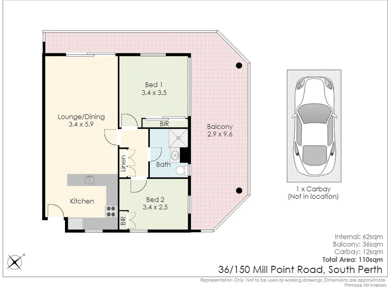 - Internal 62m2, Balcony 36m2, car bay 12m2 = 110m2 total area