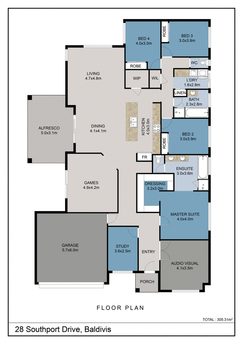 - 4 bedrooms plus study (or 5th bedroom) plus home theatre room plus games room, 2 bathrooms
