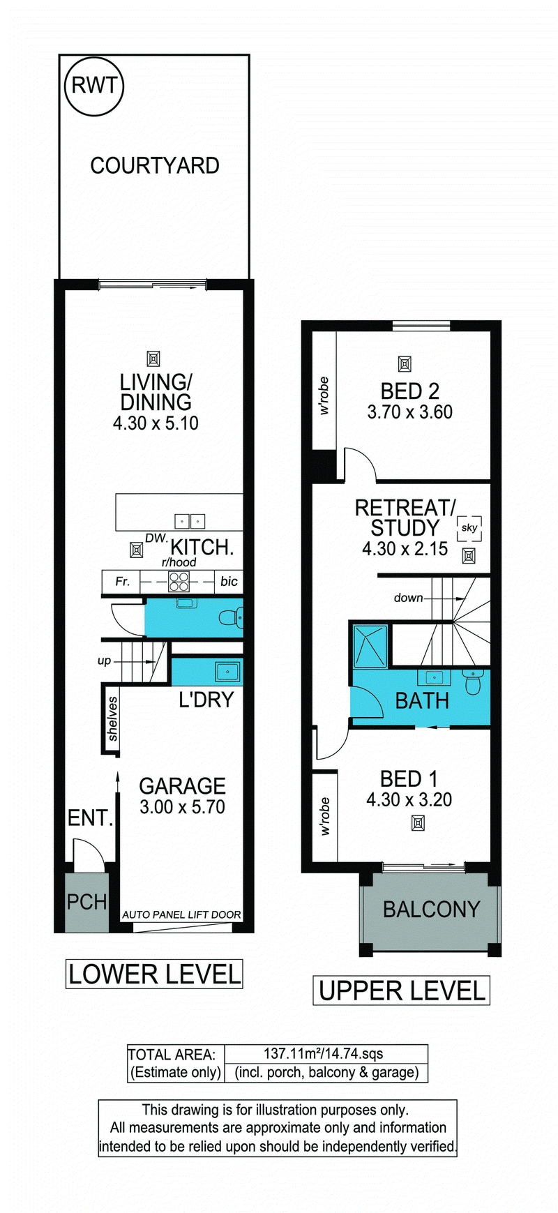 Upstairs, the generous master bedroom features a built-in robe, private balcony and direct access to the stylish two-way bathroom complete with wall-hung vanity and shaving cabinet. Bedroom two also includes a built-in robe adjacent a versatile retreat or study with skylight providing the ideal work-from-home space or quiet reading nook.