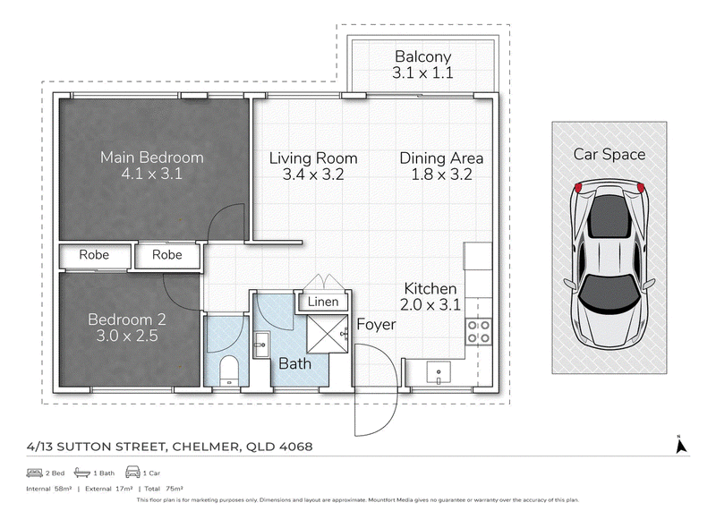 Sliding doors open from the living area onto a north-facing balcony, where you can relax and unwind while overlooking peaceful, leafy treetops - the perfect spot for your morning coffee or afternoon breeze.