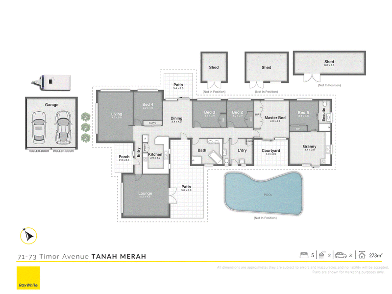 The property currently features a spacious 5-bedroom, 2-bathroom residence, complete with an in-ground pool and three separate sheds-providing holding income, owner-occupier appeal, or interim use while future plans are explored.
