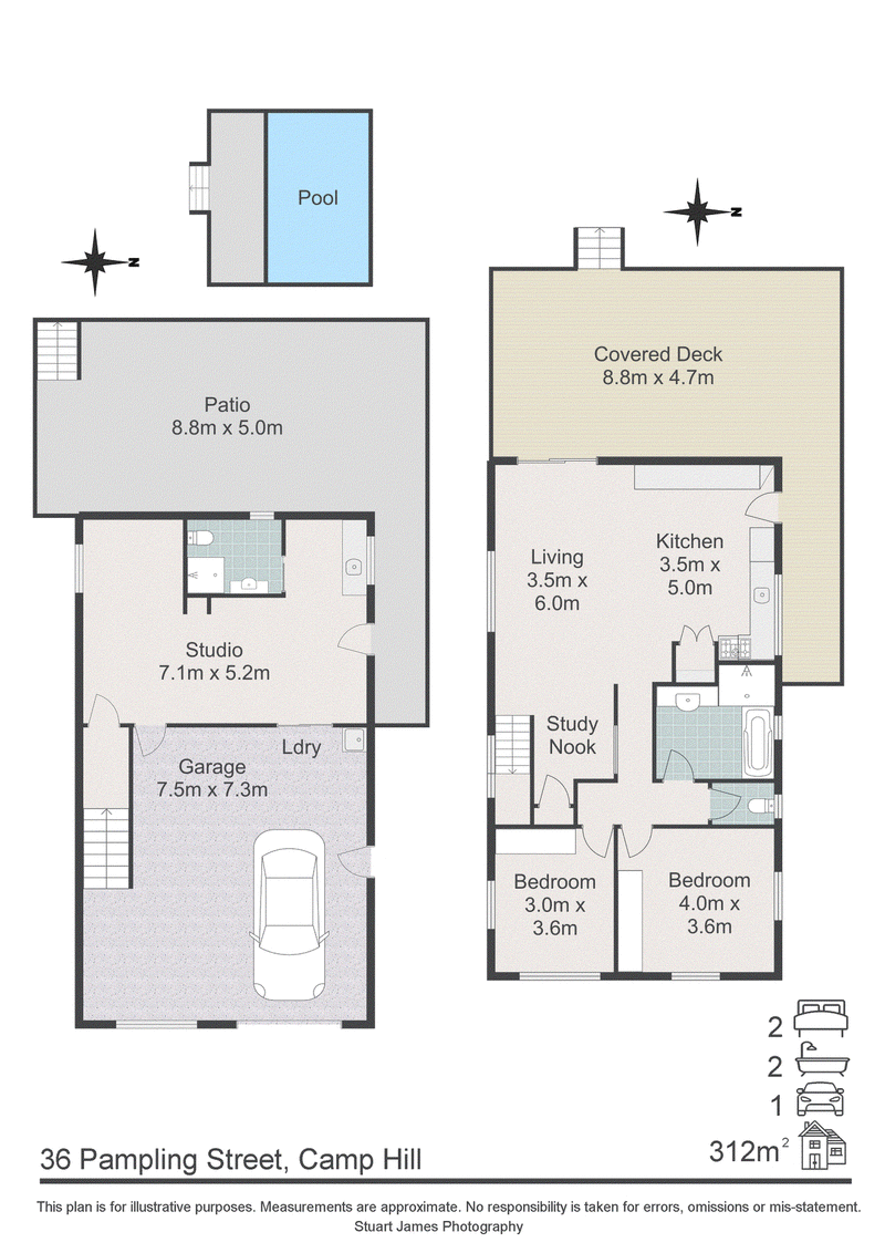 Boasting two bedrooms, a studio and two bathrooms, it caters effortlessly to both privacy and communal living needs. The heart of the home features an inviting open-plan kitchen and living area, seamlessly extending to a covered deck, perfect for alfresco dining and entertaining.