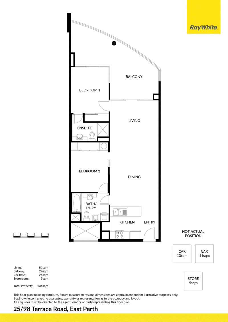 Internal: 81sqm, Balcony: 24sqm, Car Bays: 24sqm, Secure Store: 5sqm, Total: 134sqm