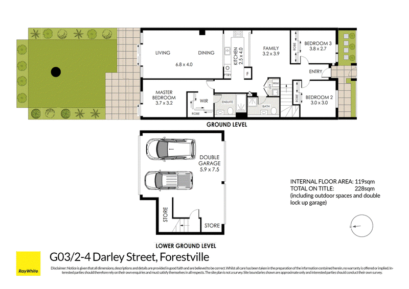 • 119 Sqm internal, with 228 sqm on title, including private outdoor space and double lock up garage