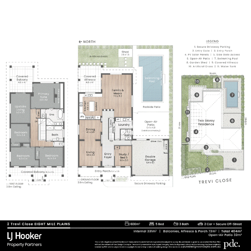 - Expansive living areas including family/meals space, formal dining, and lounge.