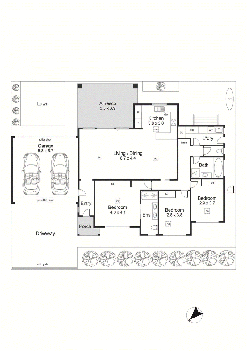 Inside, the home showcases 12mm timber floating floors and square set cornices, complemented by clear anodized windows that invite in abundant natural light. Comfort and security are paramount, with ducted reverse cycle air-conditioning, an alarm system, video intercom, and an abundance of power and data points throughout. Additional practical features include a separate linen cupboard and a well-appointed laundry with extra storage.