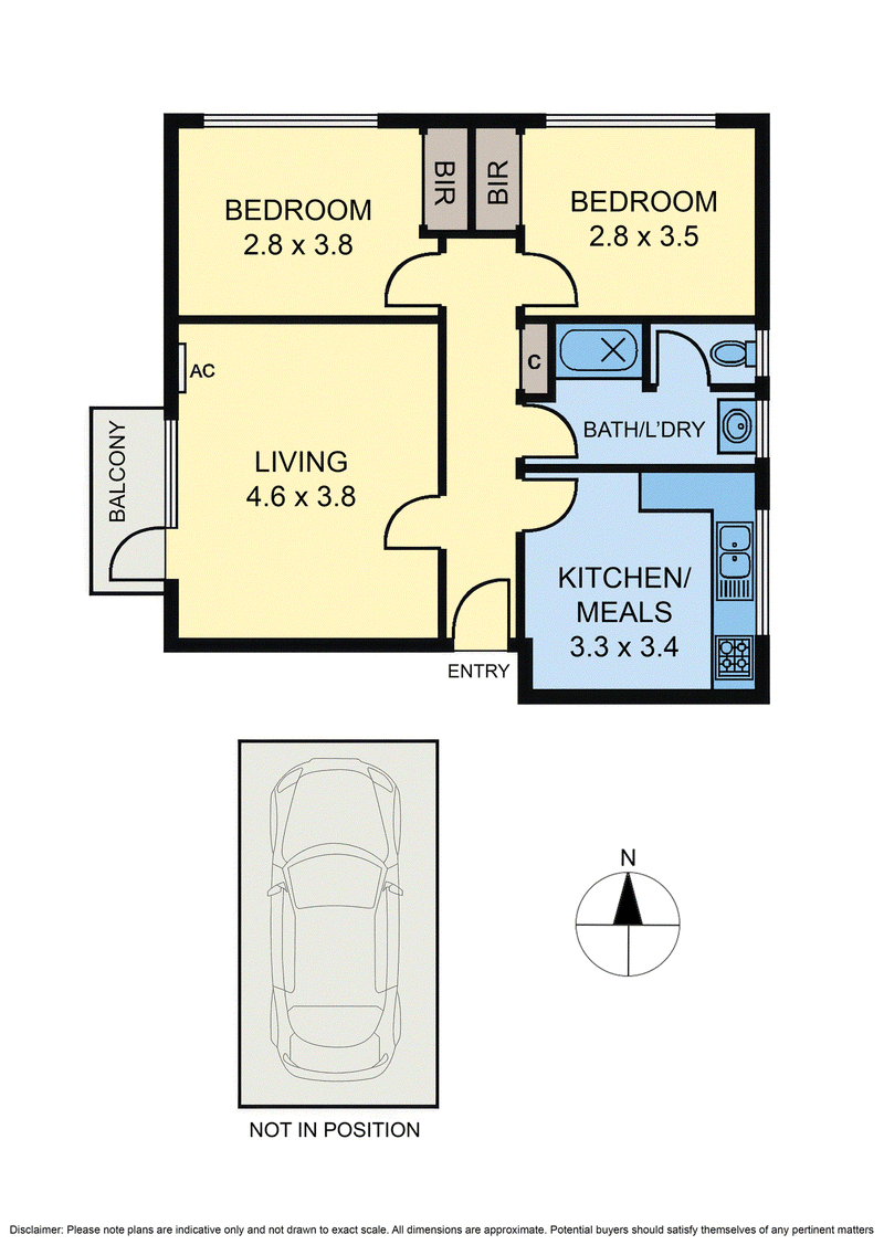 Two bedrooms with built-in robes are privately positioned from the main living zone, both enjoying a bright north-facing aspect. A combined bathroom and laundry is centrally located and efficiently arranged.