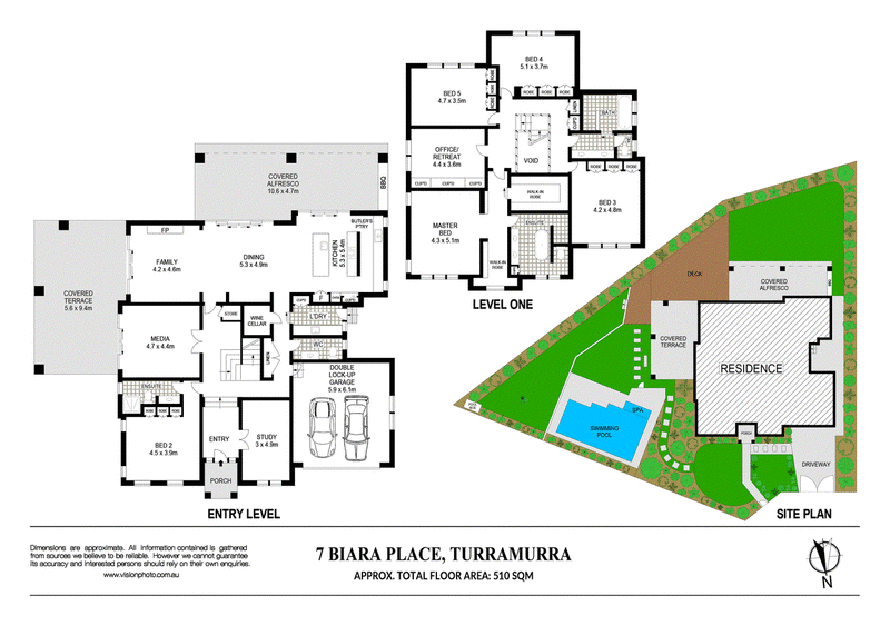 • Home office with a coffered ceiling, private guest retreat/5th bedroom with robes and ensuite